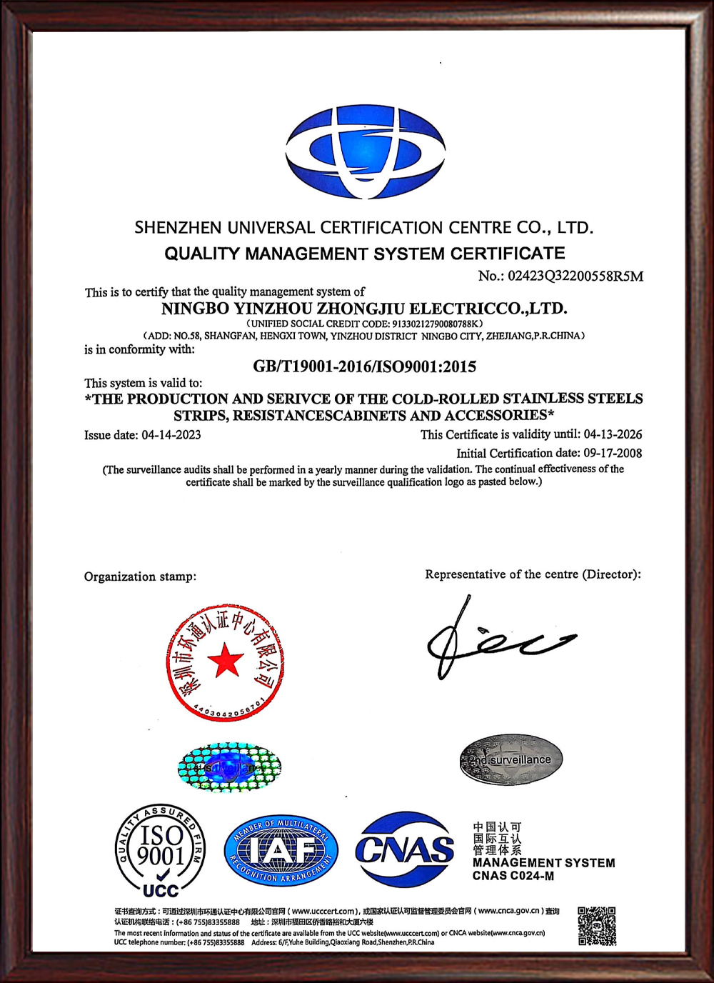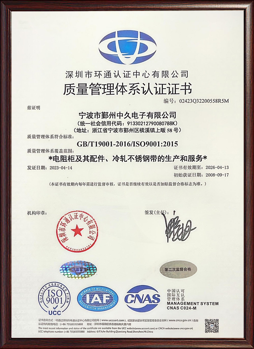 ISO質(zhì)量管理體系認(rèn)證證書